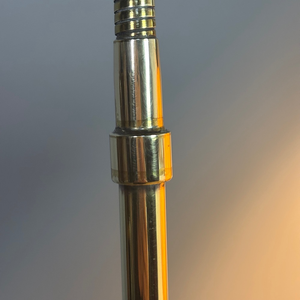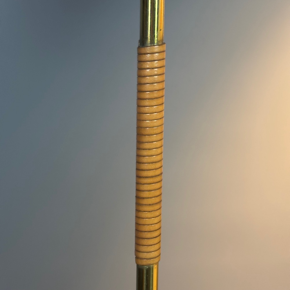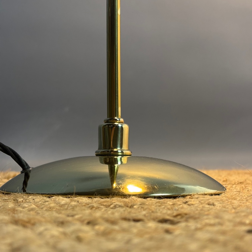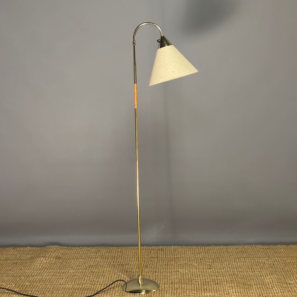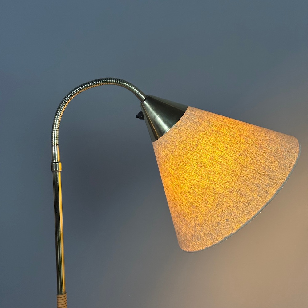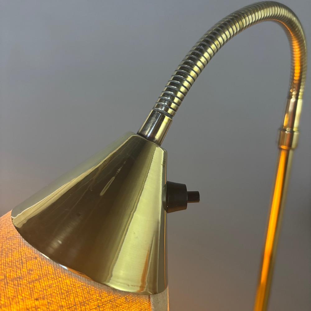 A stylish brass reading lamp, the slender upright column rising from a domed circular base, surmounted by a curved flexible neck supporting a custom-made natural linen fabric shade. The lamp has been rewired and PAT tested.