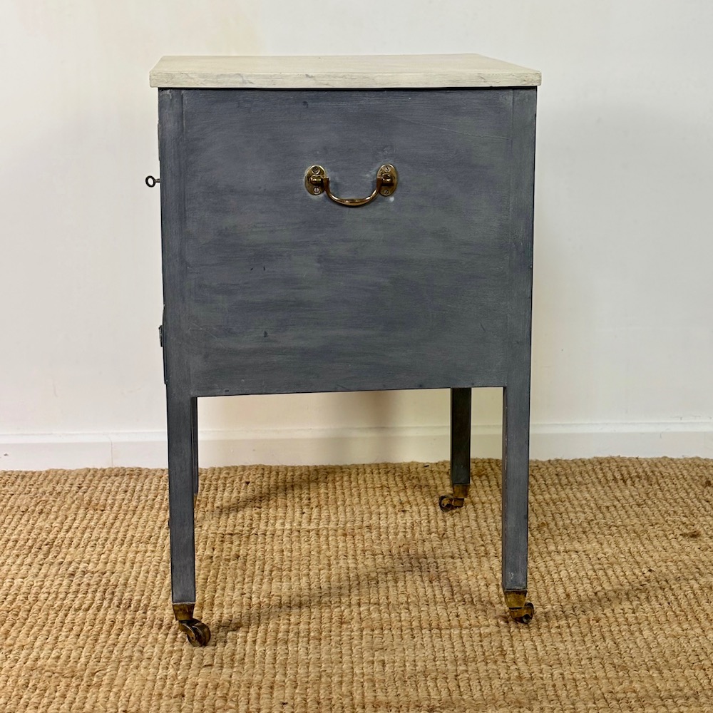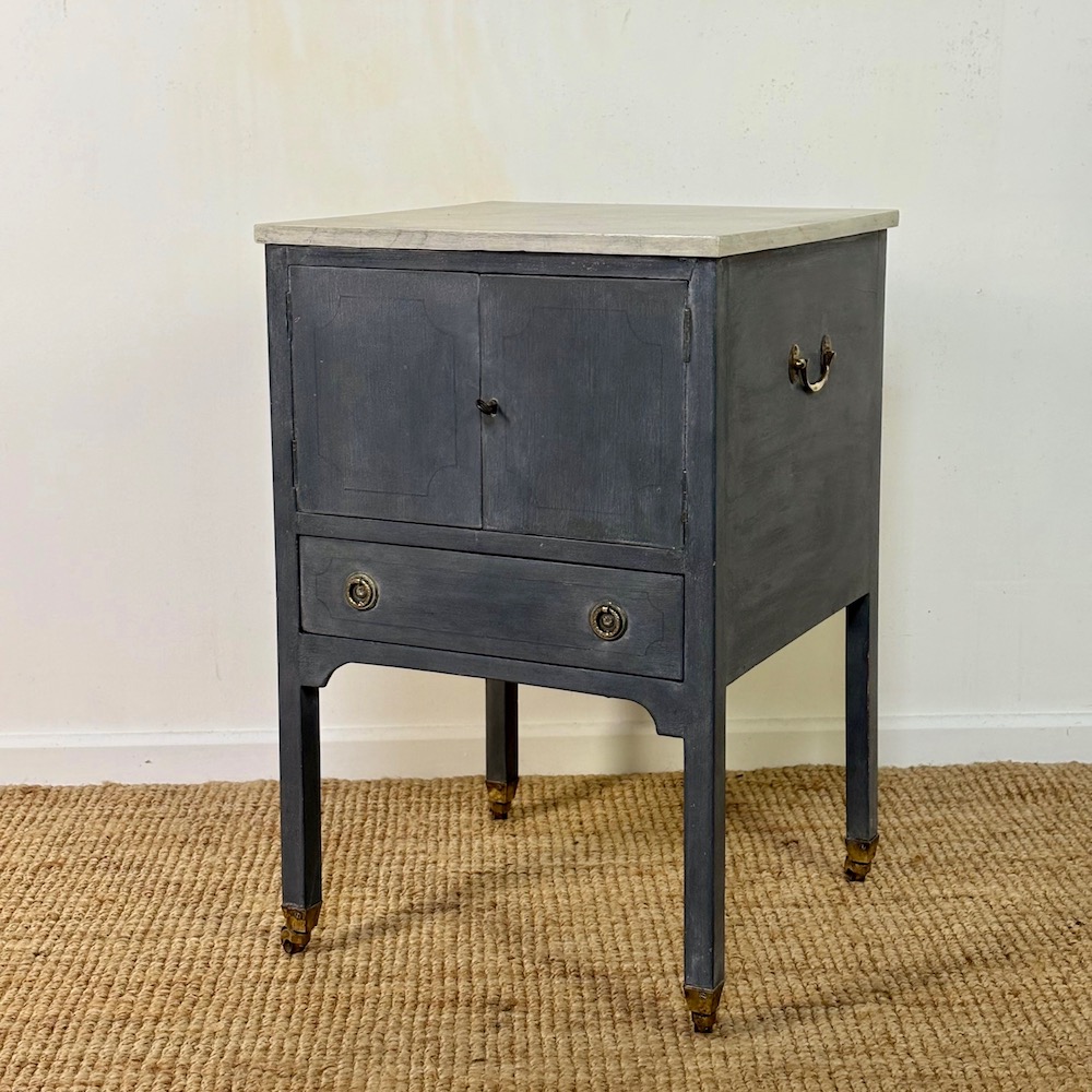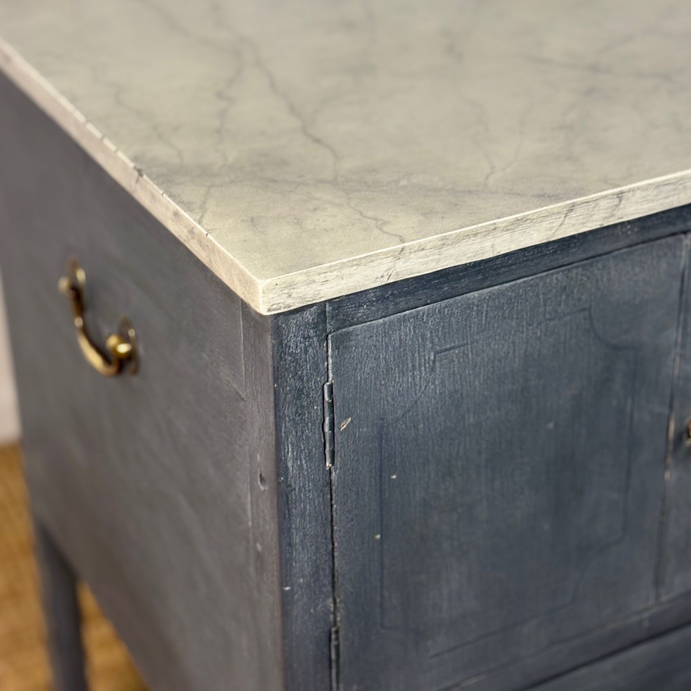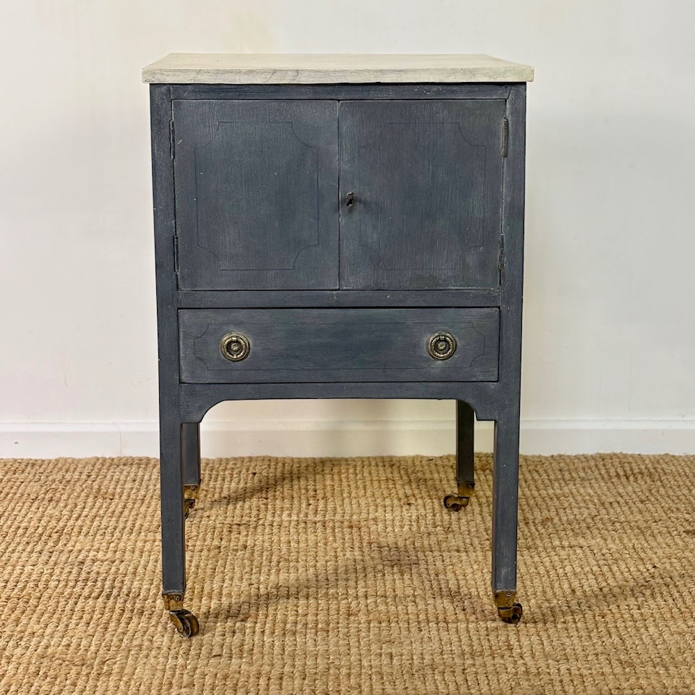 This charming and versatile antique washstand, dating from the Georgian period, painted in a distressed patinated chalk paint grey/blue finish.The cabinet is adorned with brass carrying handles, ring handles on the drawer and brass castors. The top is faux marble and it is key operated.