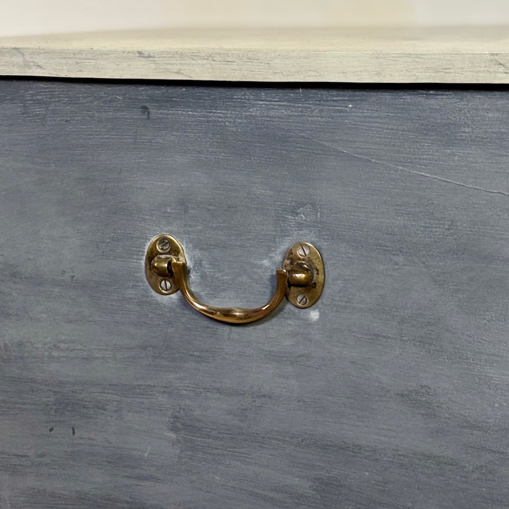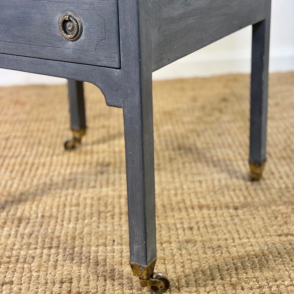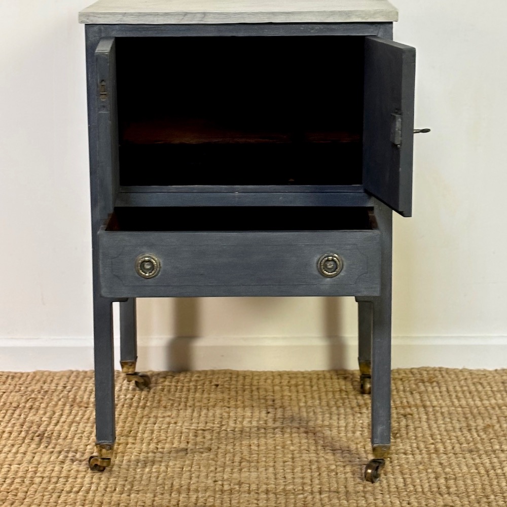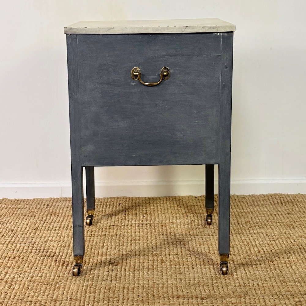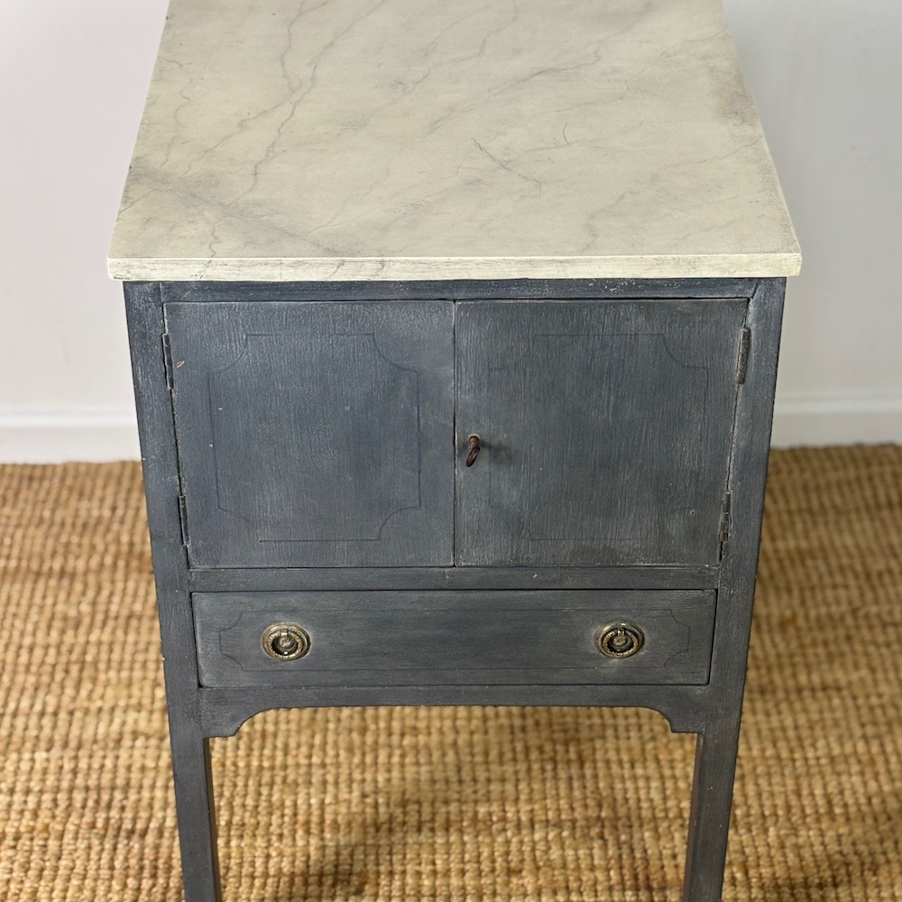 This charming and versatile antique washstand, dating from the Georgian period, painted in a distressed patinated chalk paint grey/blue finish.The cabinet is adorned with brass carrying handles, ring handles on the drawer and brass castors. The top is faux marble and it is key operated.
