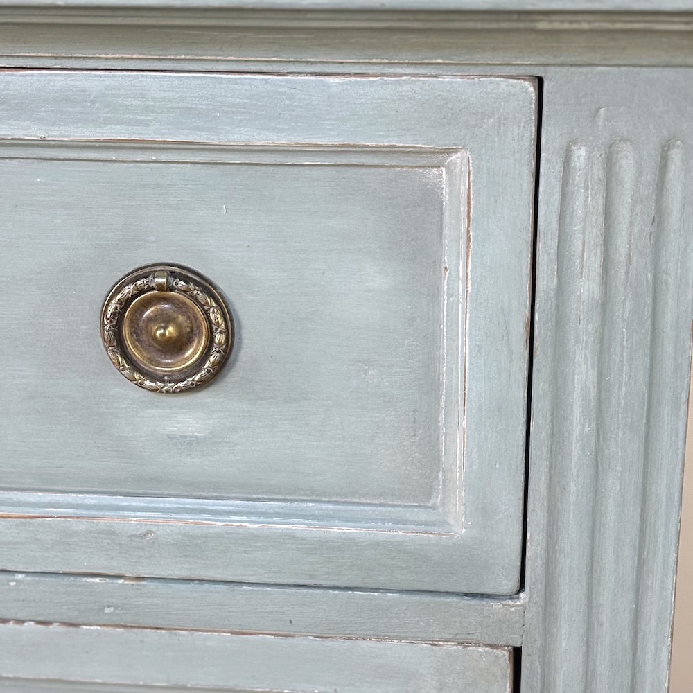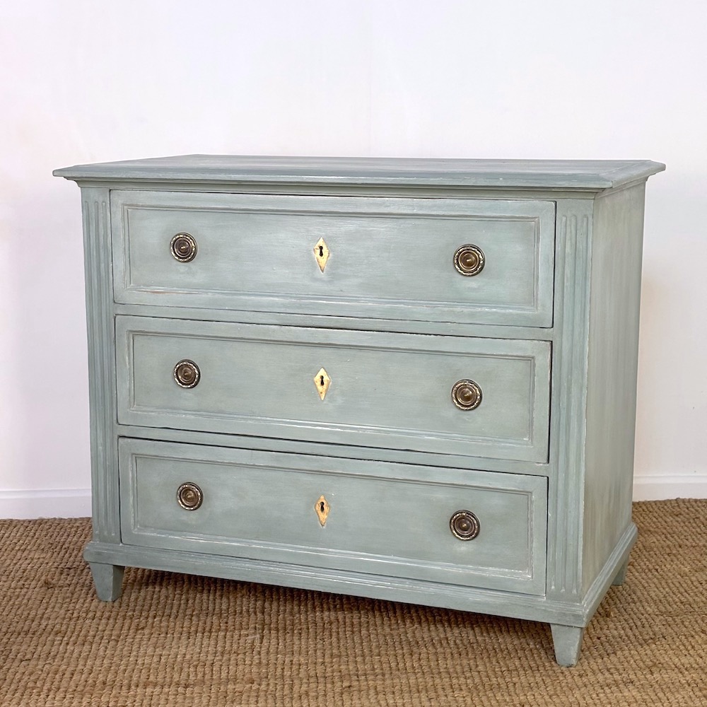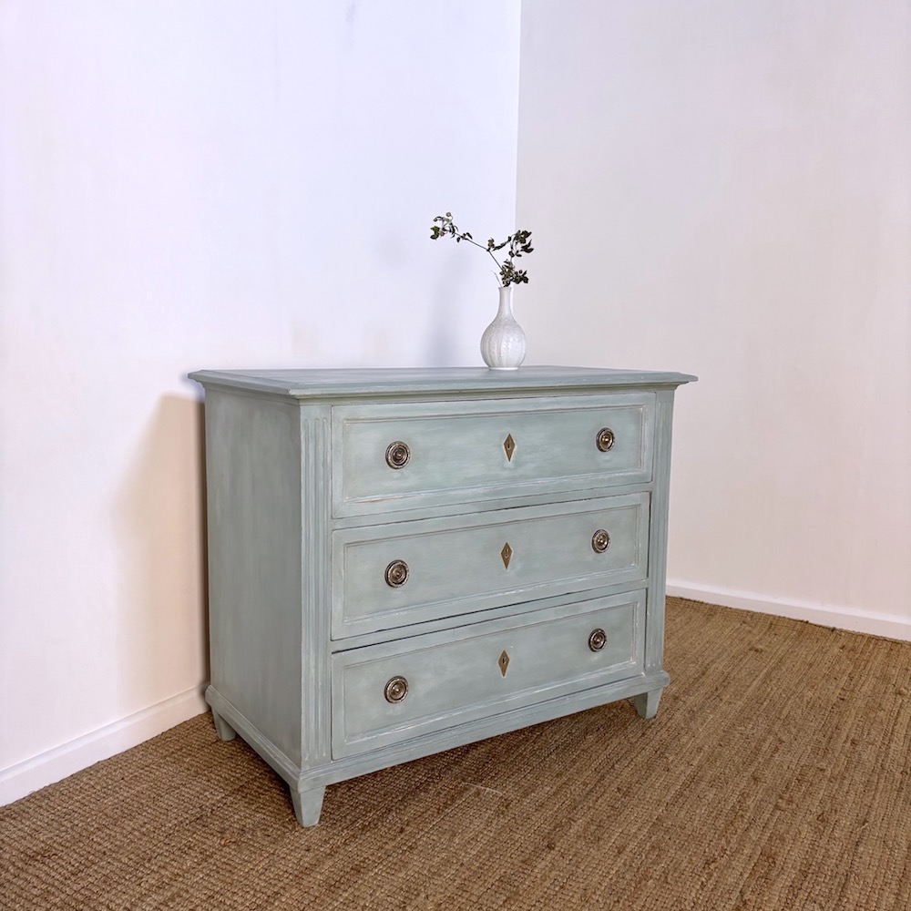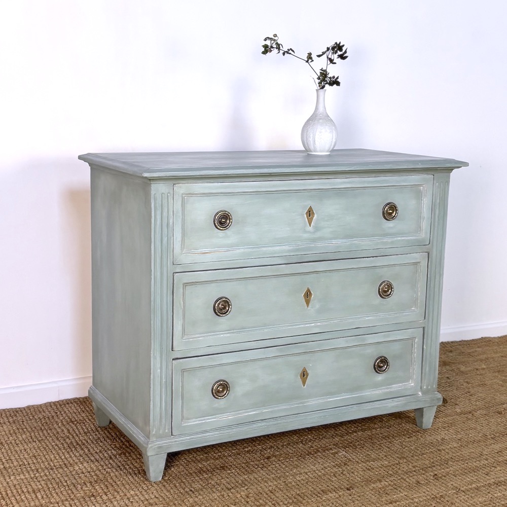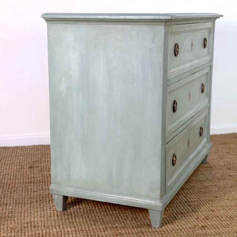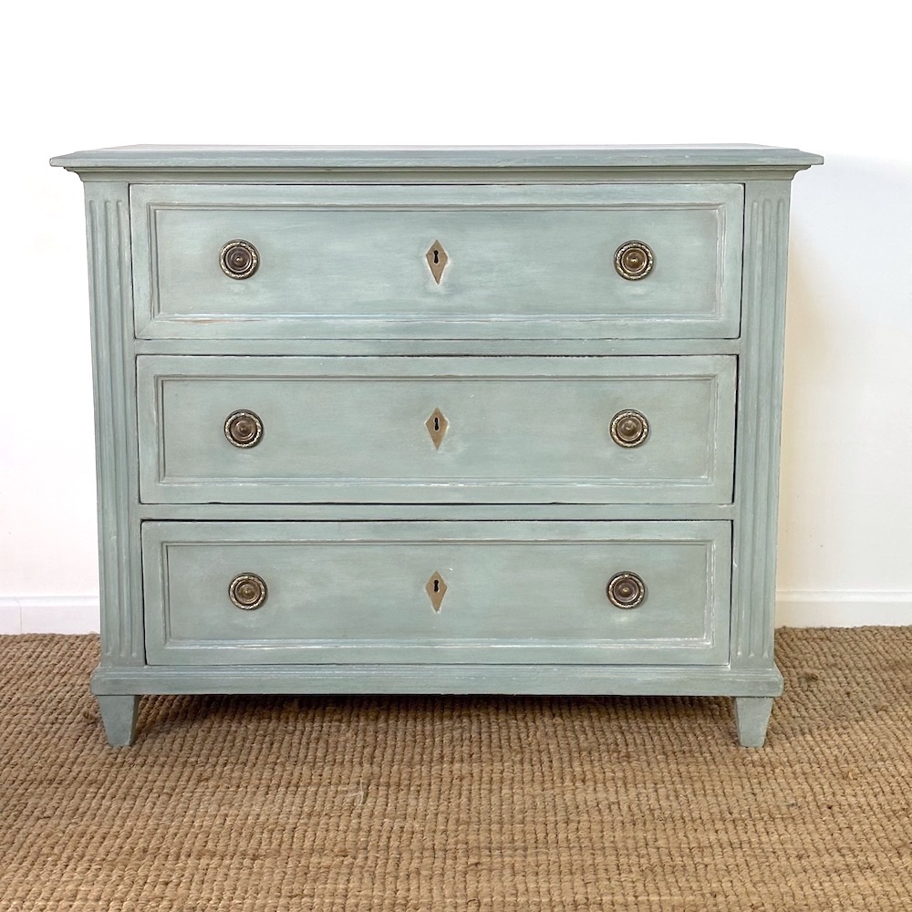 A charming 19th century Scandinavian chest of drawers, executed in the elegant Gustavian style. This piece features a classic rectangular silhouette with three full-width drawers, each meticulously restored for smooth operation . The chest is distinguished by its fluted side columns and sits on tapered, square legs characteristic of the period . Finished in a later chalk paint Farrow and Ball close to "Parma Gray" and "Green Blue", providing a soft, distressed aesthetic. The antique handles and escutcheons are solid brass.