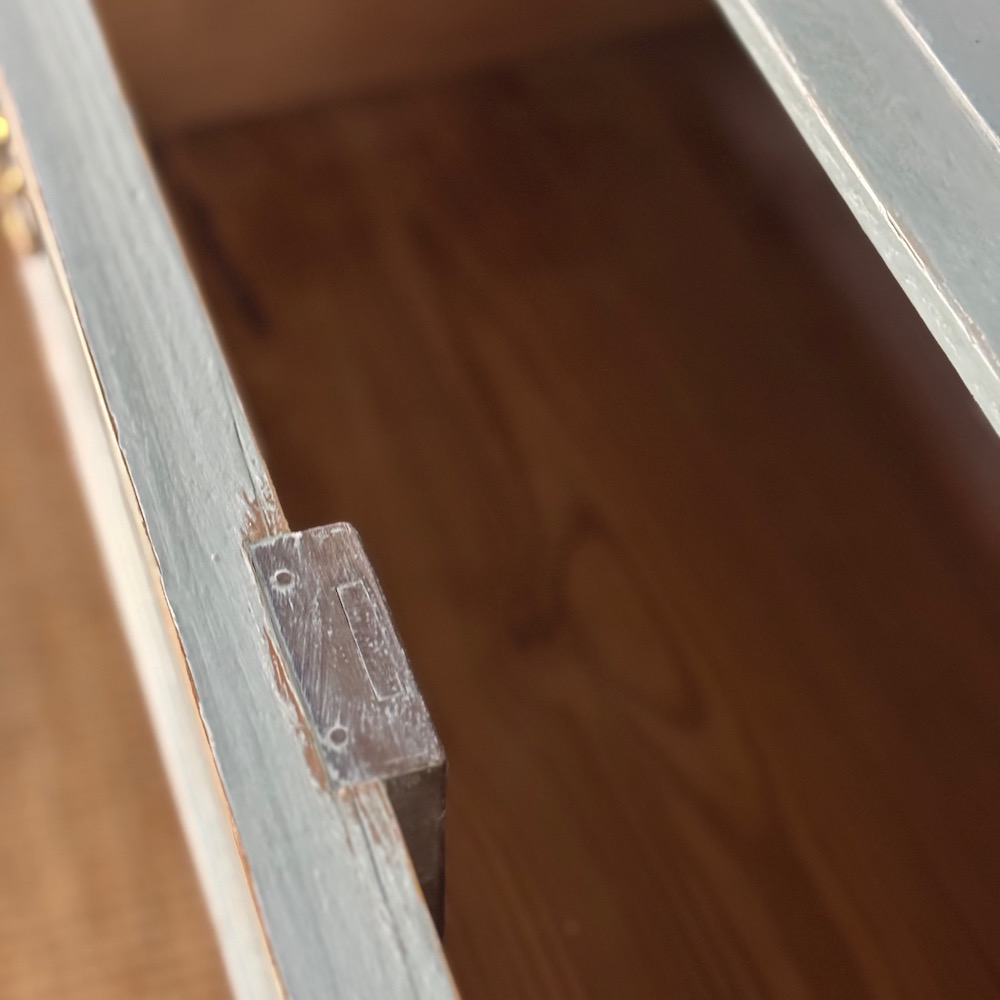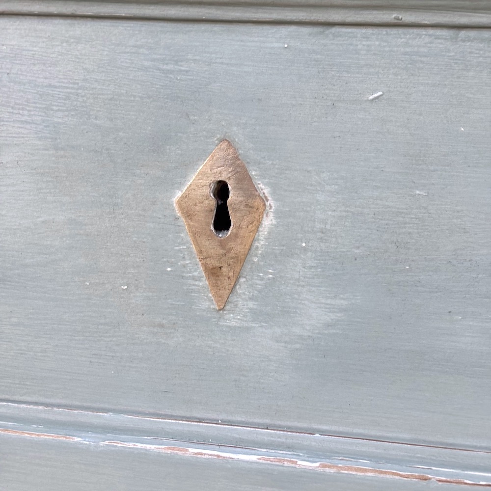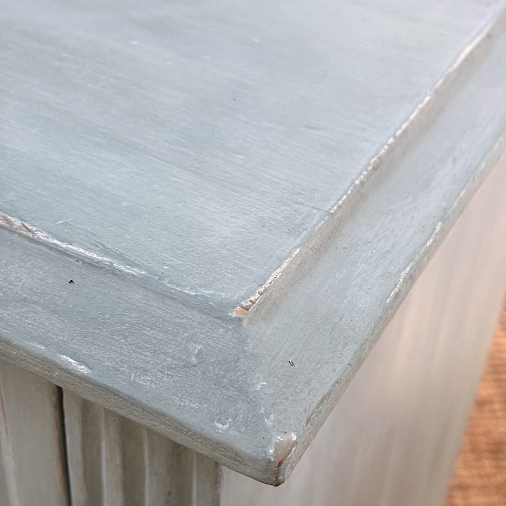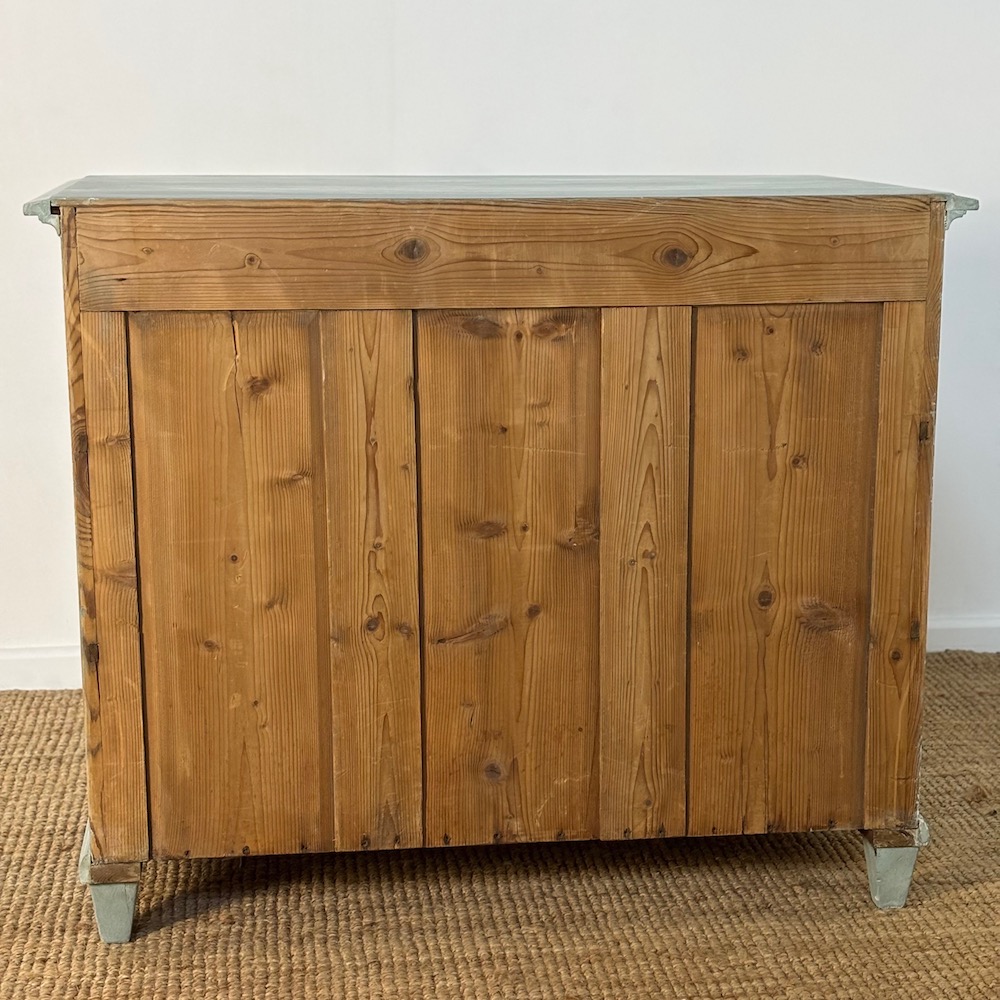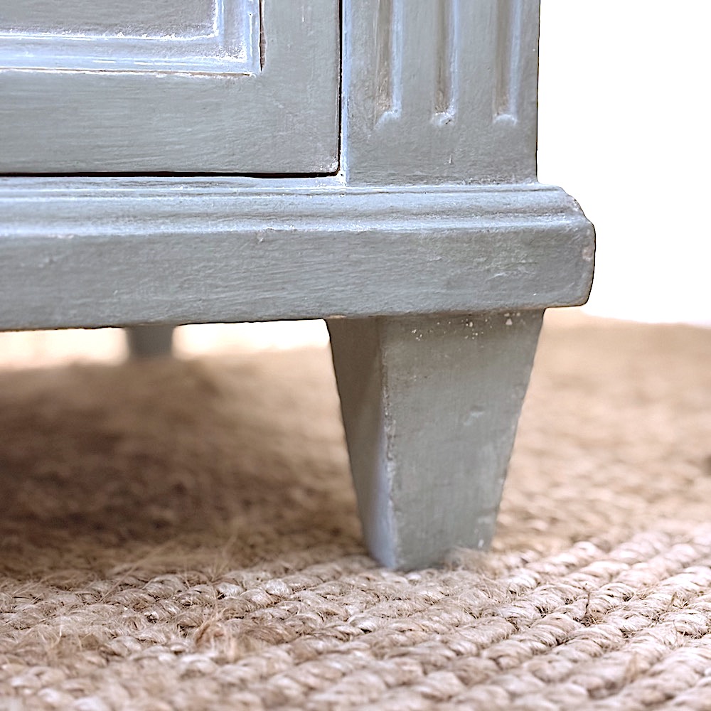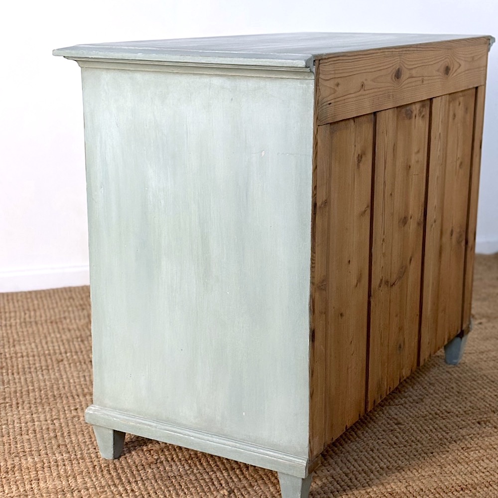 A charming 19th century Scandinavian chest of drawers, executed in the elegant Gustavian style. This piece features a classic rectangular silhouette with three full-width drawers, each meticulously restored for smooth operation . The chest is distinguished by its fluted side columns and sits on tapered, square legs characteristic of the period . Finished in a later chalk paint Farrow and Ball close to "Parma Gray" and "Green Blue", providing a soft, distressed aesthetic. The antique handles and escutcheons are solid brass.
