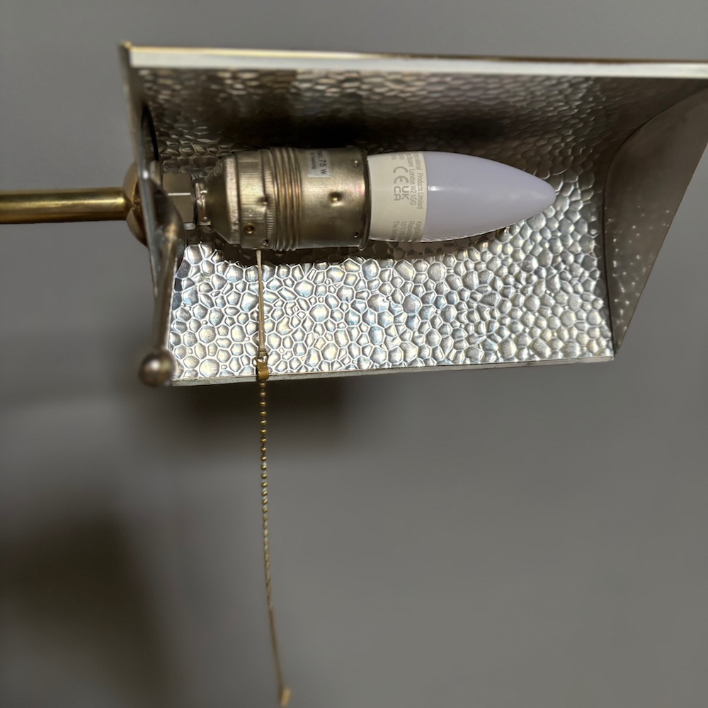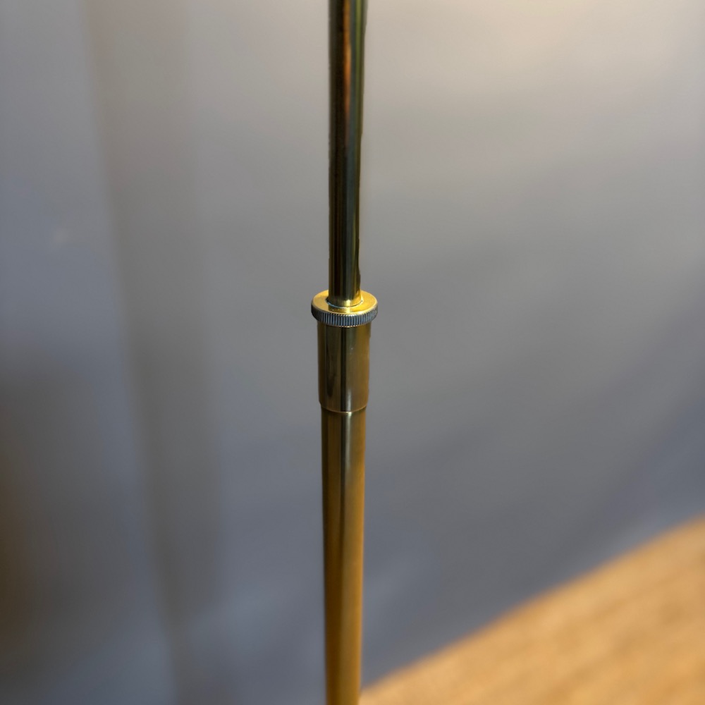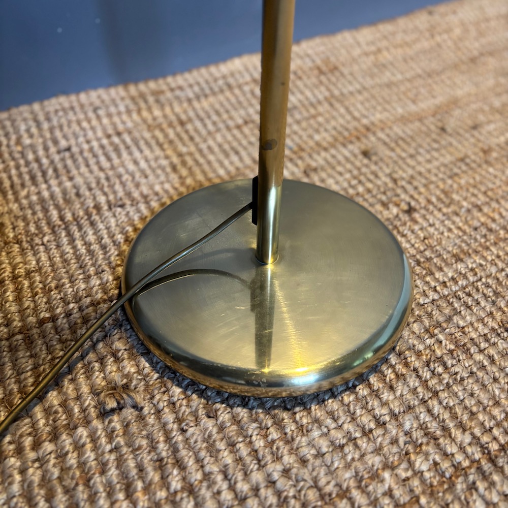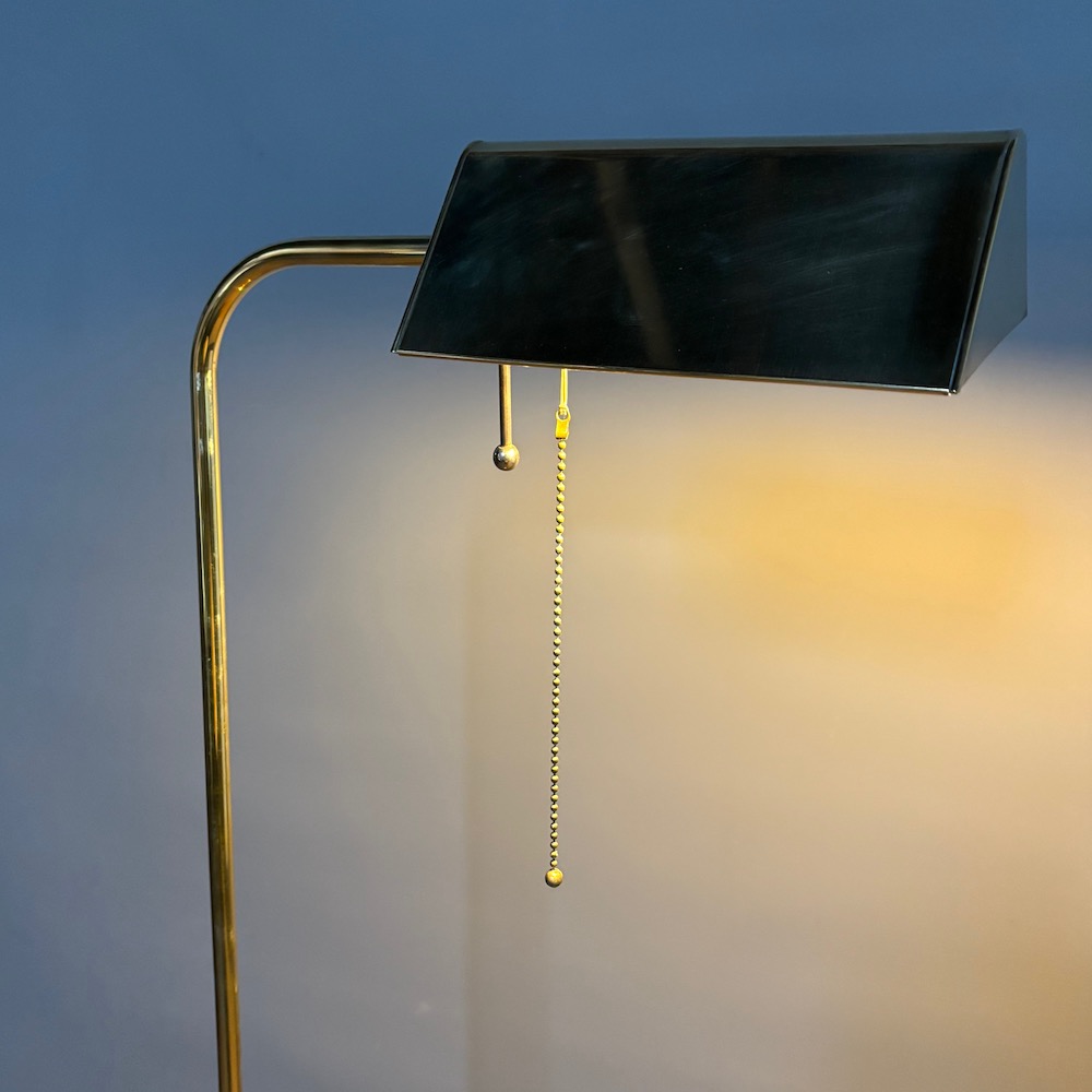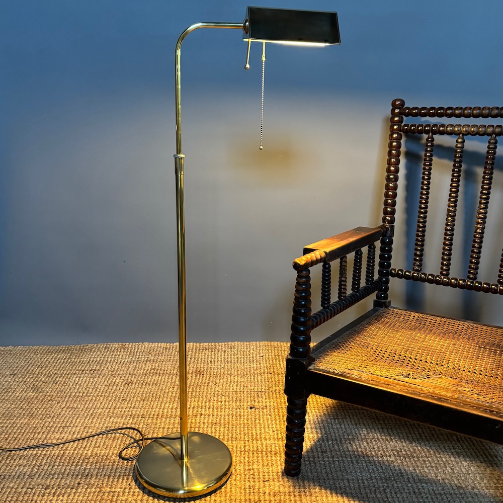 A stylish brass standard lamp by Soelken Leuchten, designed in the classic pharmacy style in the 1970s, the circular weighted base supporting a slender upright column with a curved arm, terminating in a rectangular shade. The lamp is fitted with a pull chain switch beneath the shade , allowing for directional , focused lighting , ideal for reading or task use.The adjustable height of the lamp is from 95 cm to 150 cm . This lamp has been PAT tested.