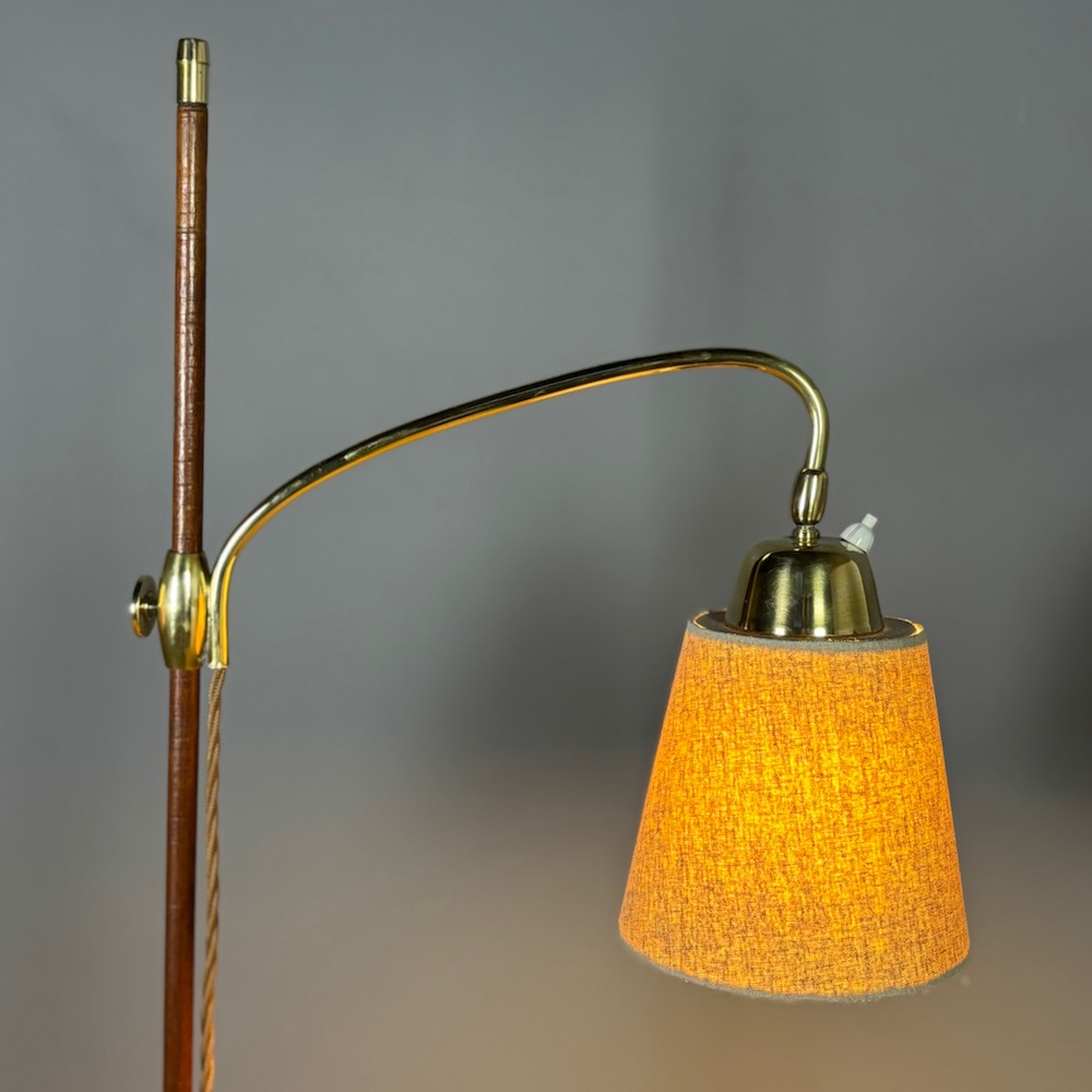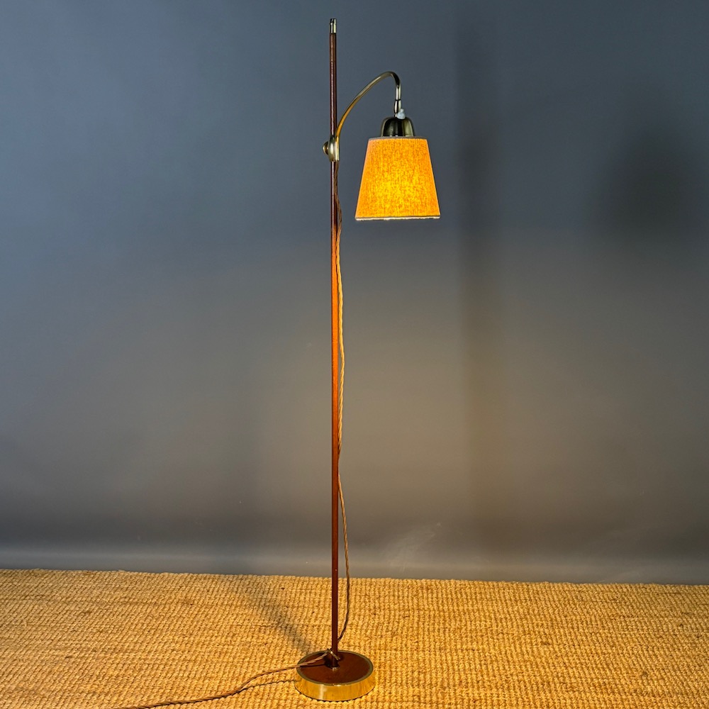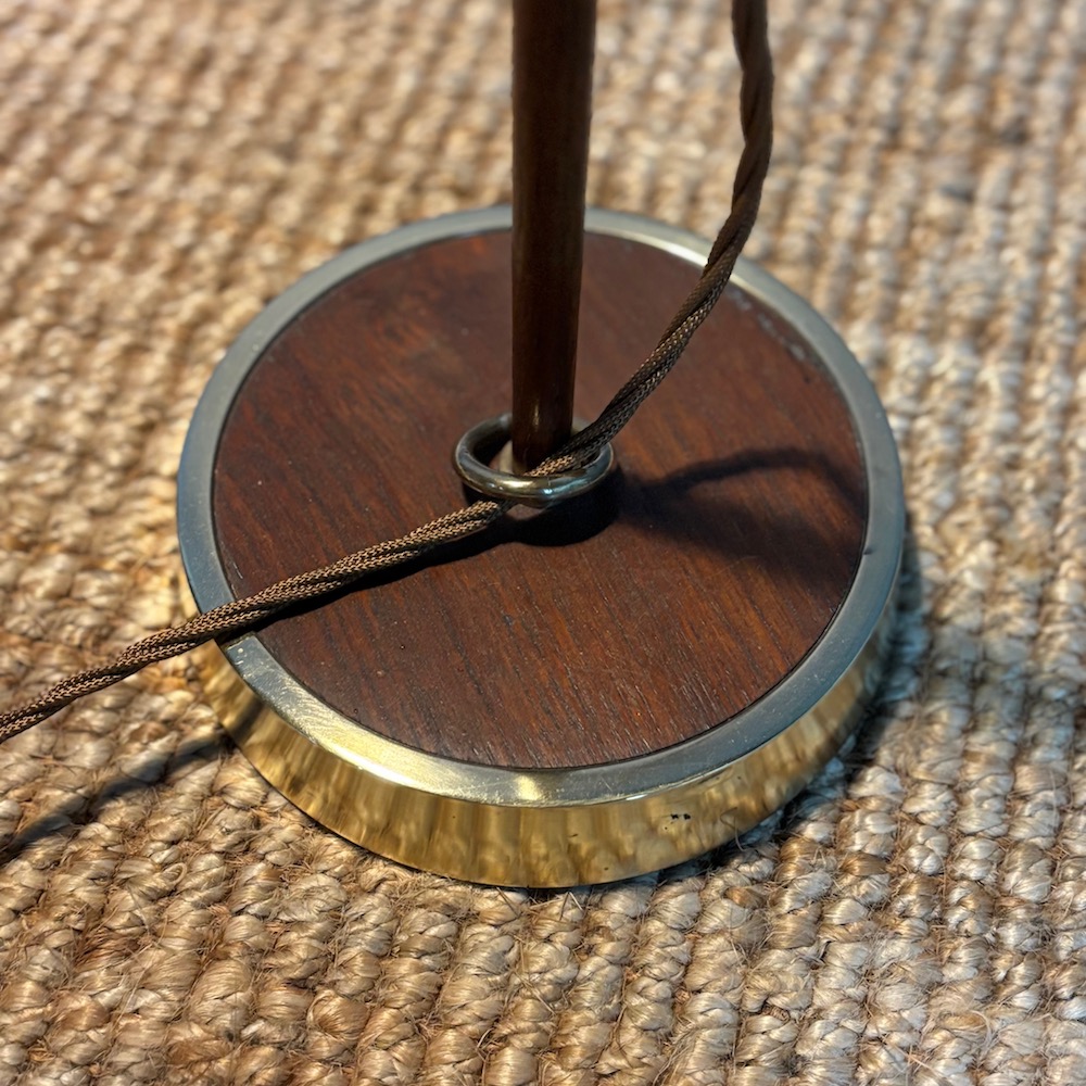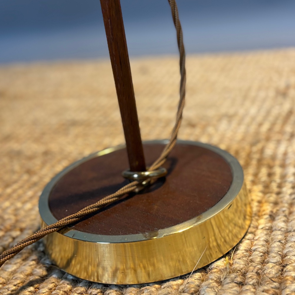 A stylish Danish floor lamp from the 1960s featuring a brass adjustable arm and a weighted circular base. The upright stem is wrapped in teak veneer , adding warmth and character. The swivel arm allows for adjustable lighting, ideal for reading and accent use. The exposed cord , which is subtle integrated into the structure via a brass ring, reinforces the lamp's utilitarian aesthetic without compromising its visual clarity. Classic mid-century modern design with clean lines and functional elegance. The lamp has been rewired and PAT tested.