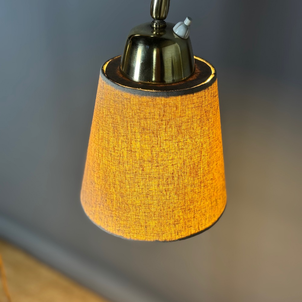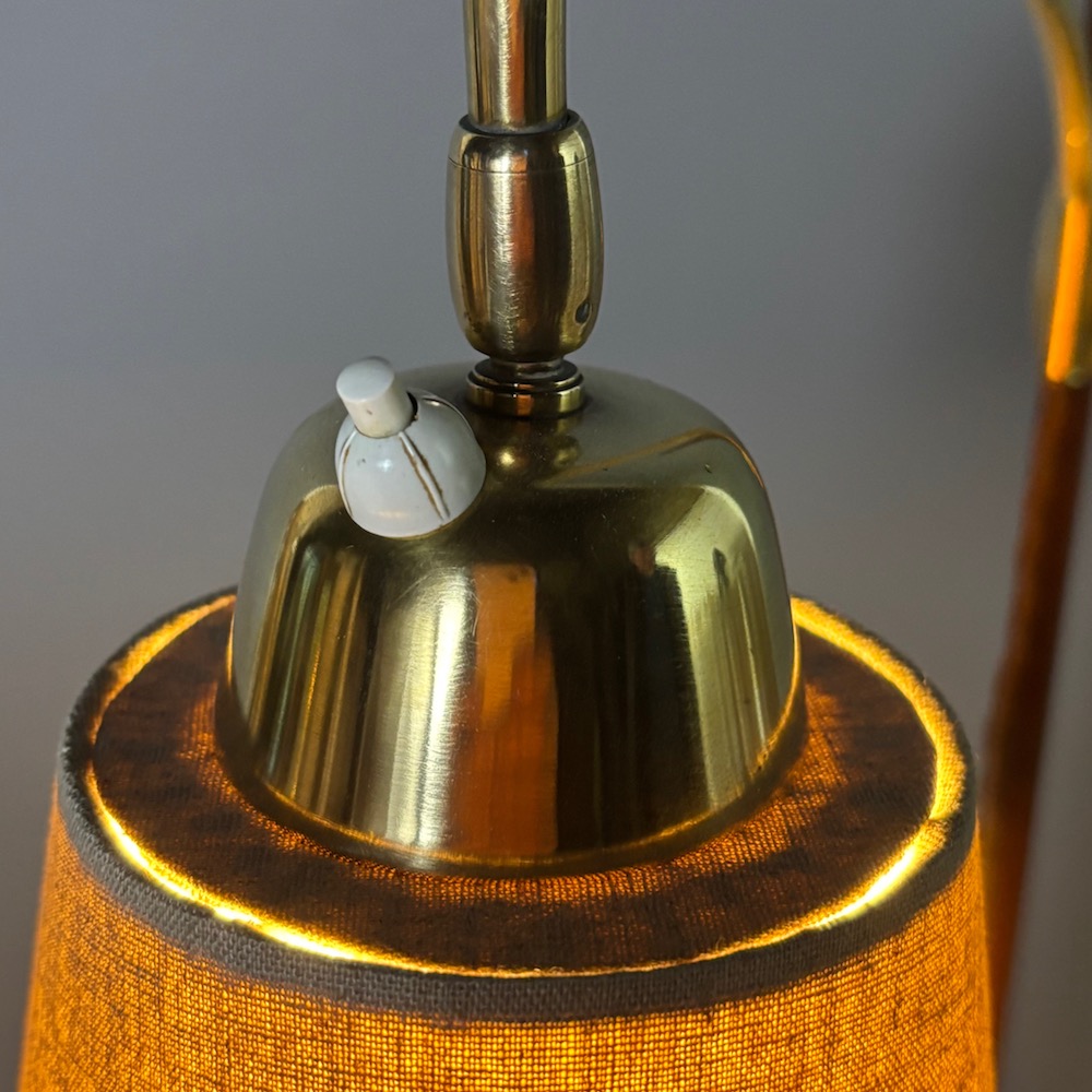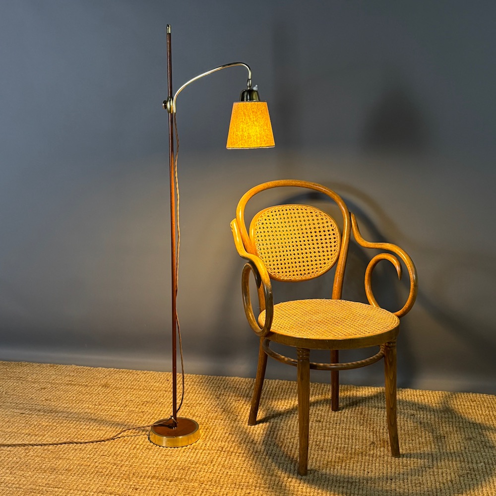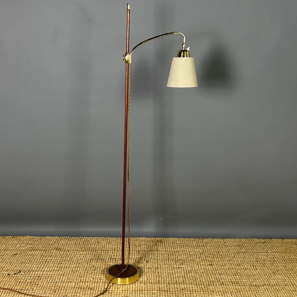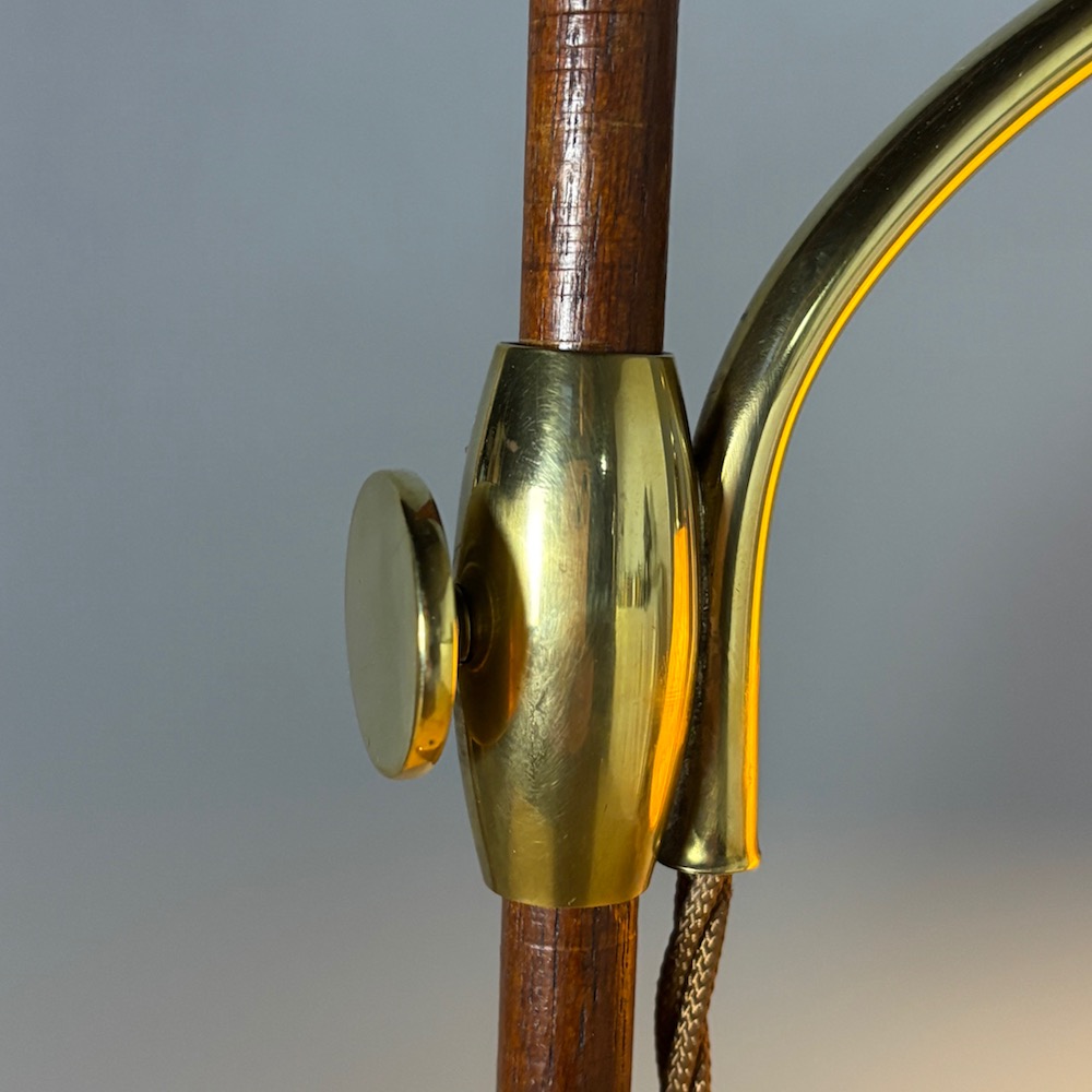 A stylish Danish floor lamp from the 1960s featuring a brass adjustable arm and a weighted circular base. The upright stem is wrapped in teak veneer , adding warmth and character. The swivel arm allows for adjustable lighting, ideal for reading and accent use. The exposed cord , which is subtle integrated into the structure via a brass ring, reinforces the lamp's utilitarian aesthetic without compromising its visual clarity. Classic mid-century modern design with clean lines and functional elegance. The lamp has been rewired and PAT tested.