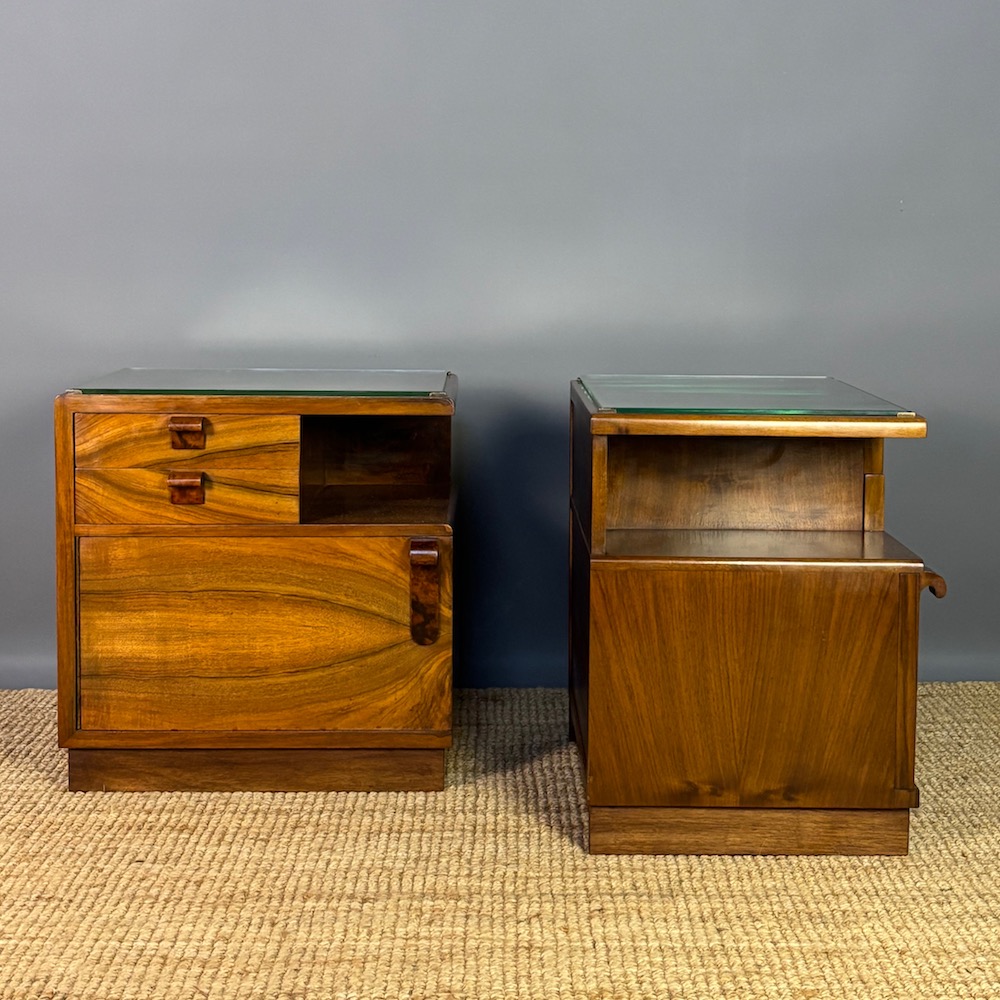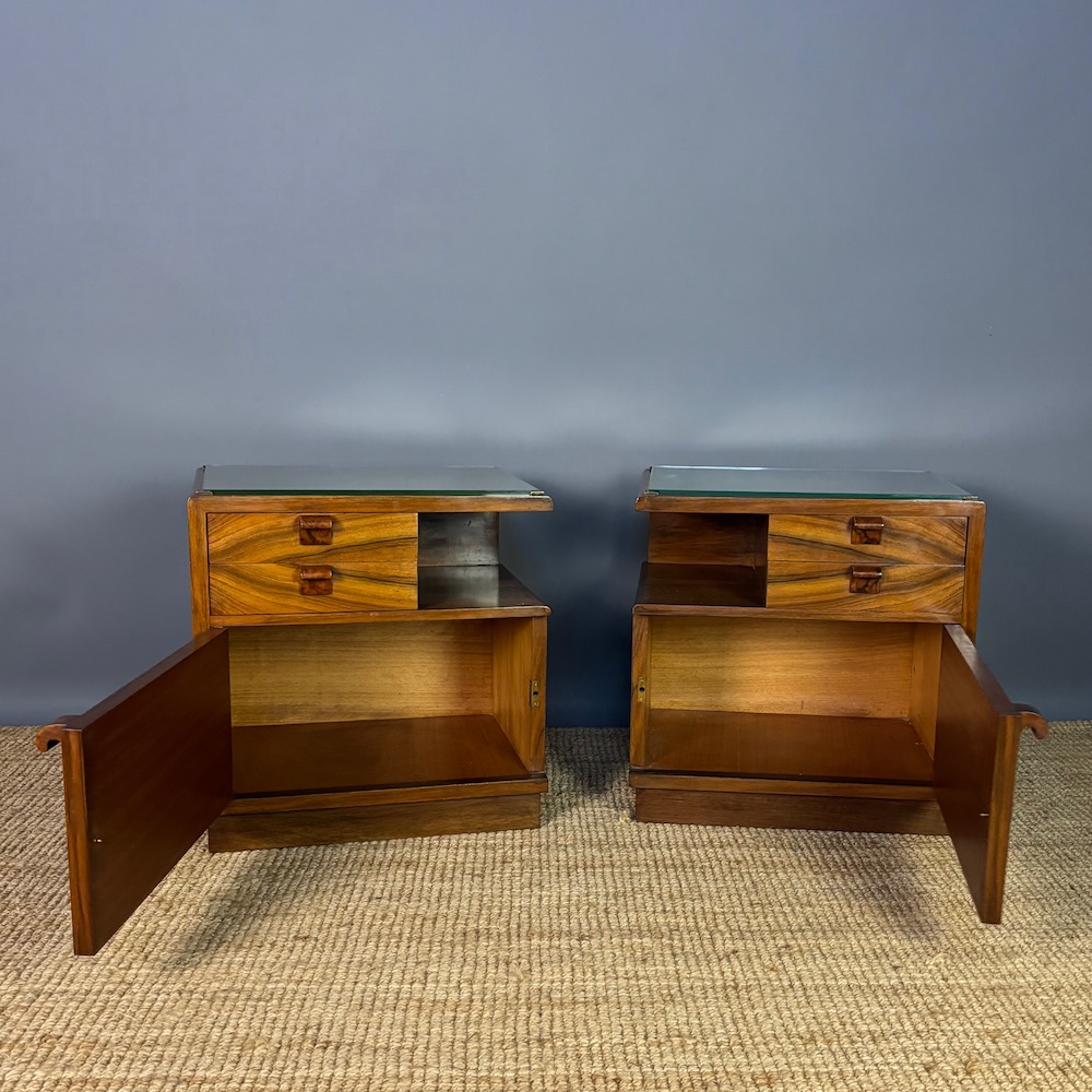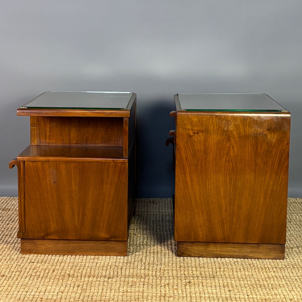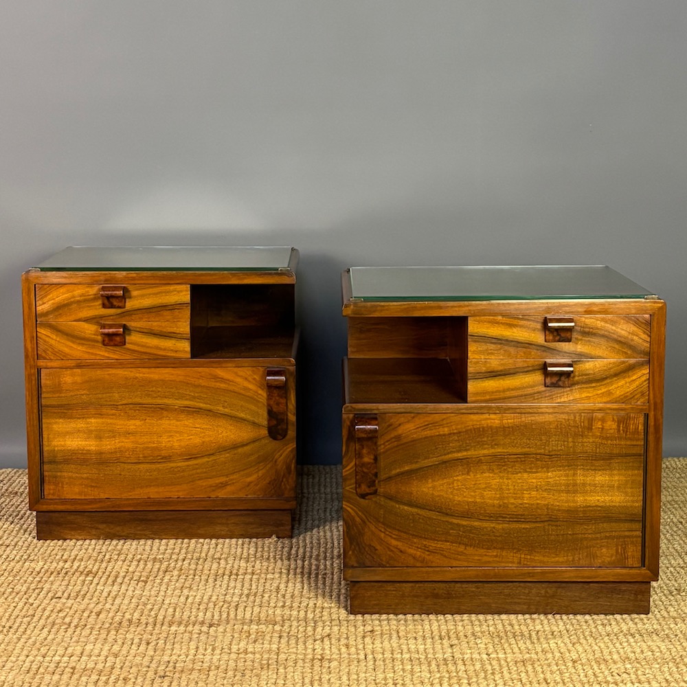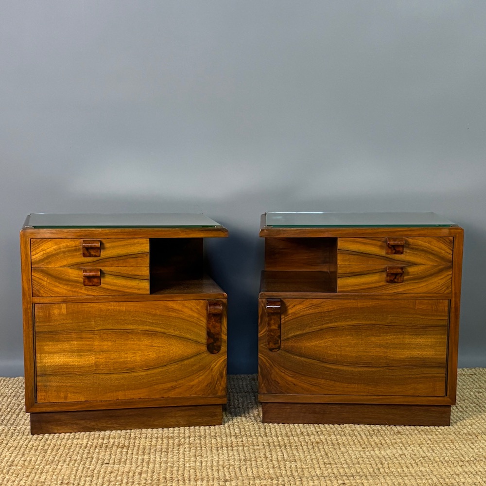 A finely matched pair of Art Deco walnut bedside cabinets, each with a stepped glass top above an open recess and two drawers with sculpted solid burr walnut handles, raised on a plinth base. The book-matched walnut veneers display rich figuring and warm tones.
