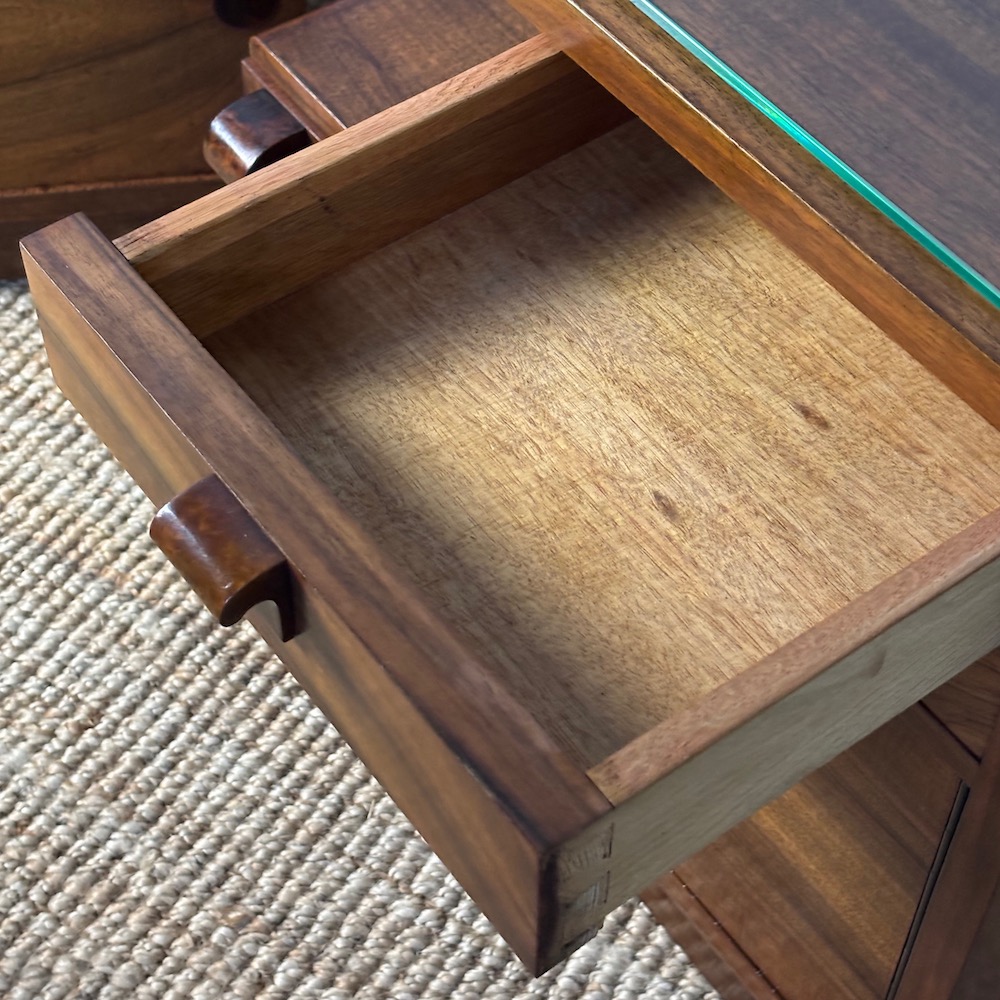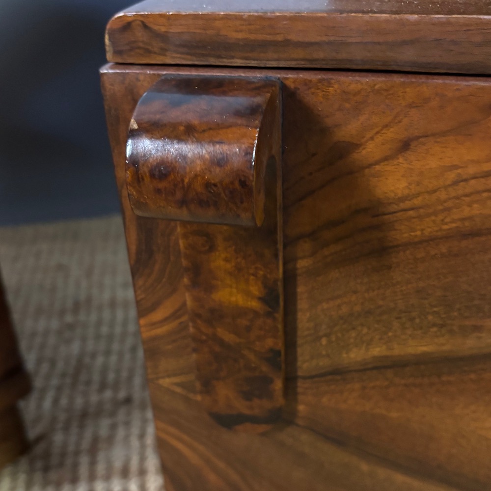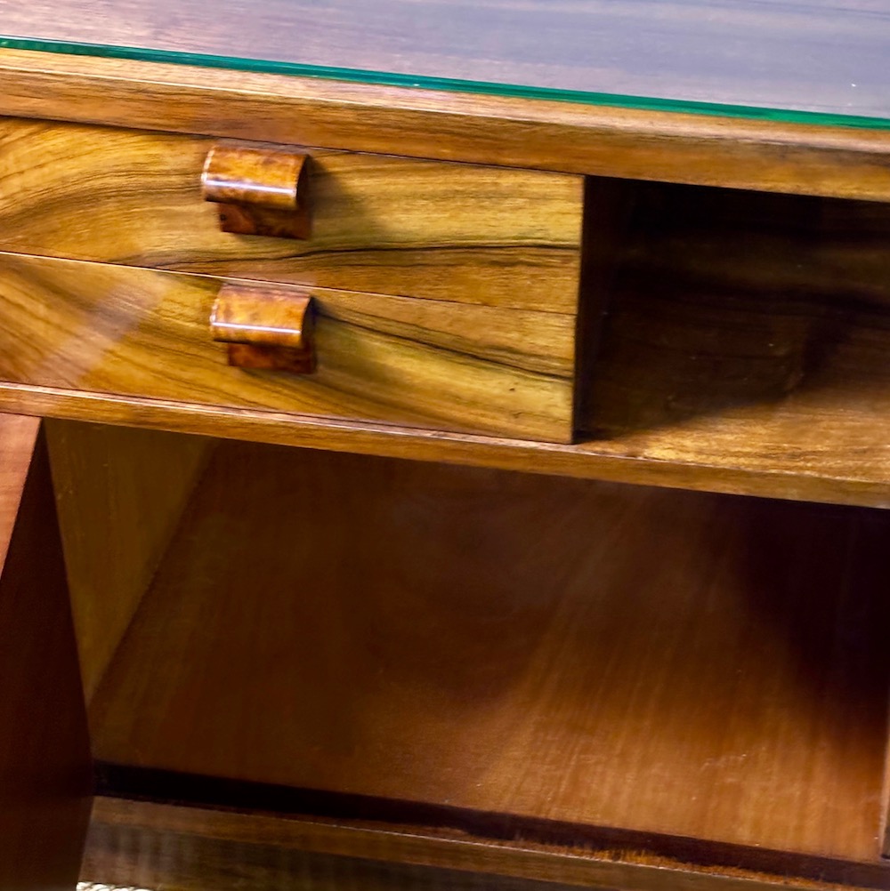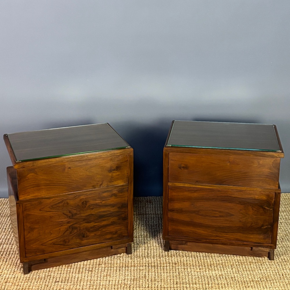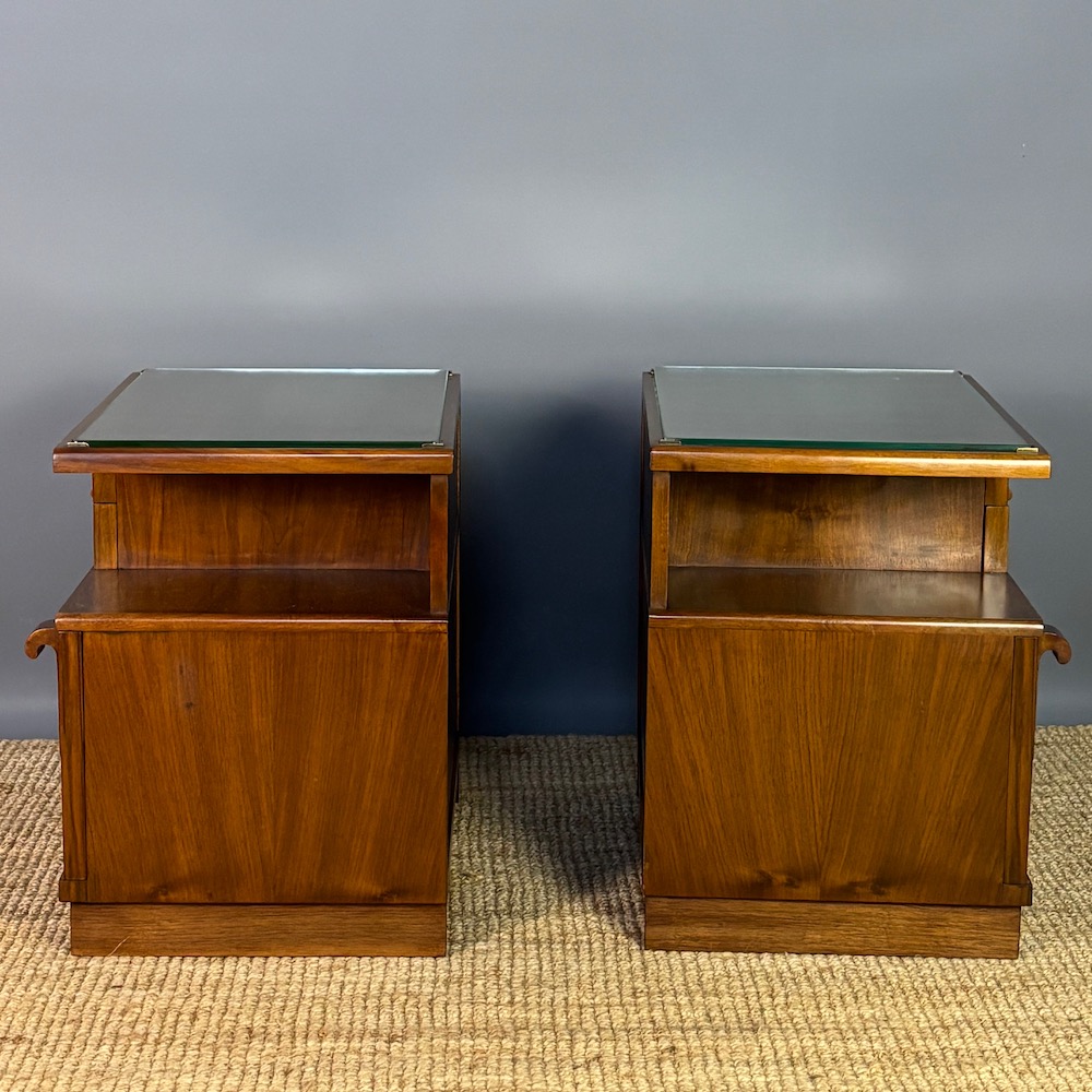 A finely matched pair of Art Deco walnut bedside cabinets, each with a stepped glass top above an open recess and two drawers with sculpted solid burr walnut handles, raised on a plinth base. The book-matched walnut veneers display rich figuring and warm tones.