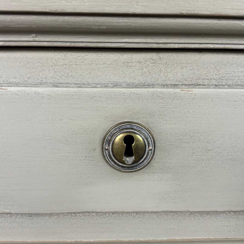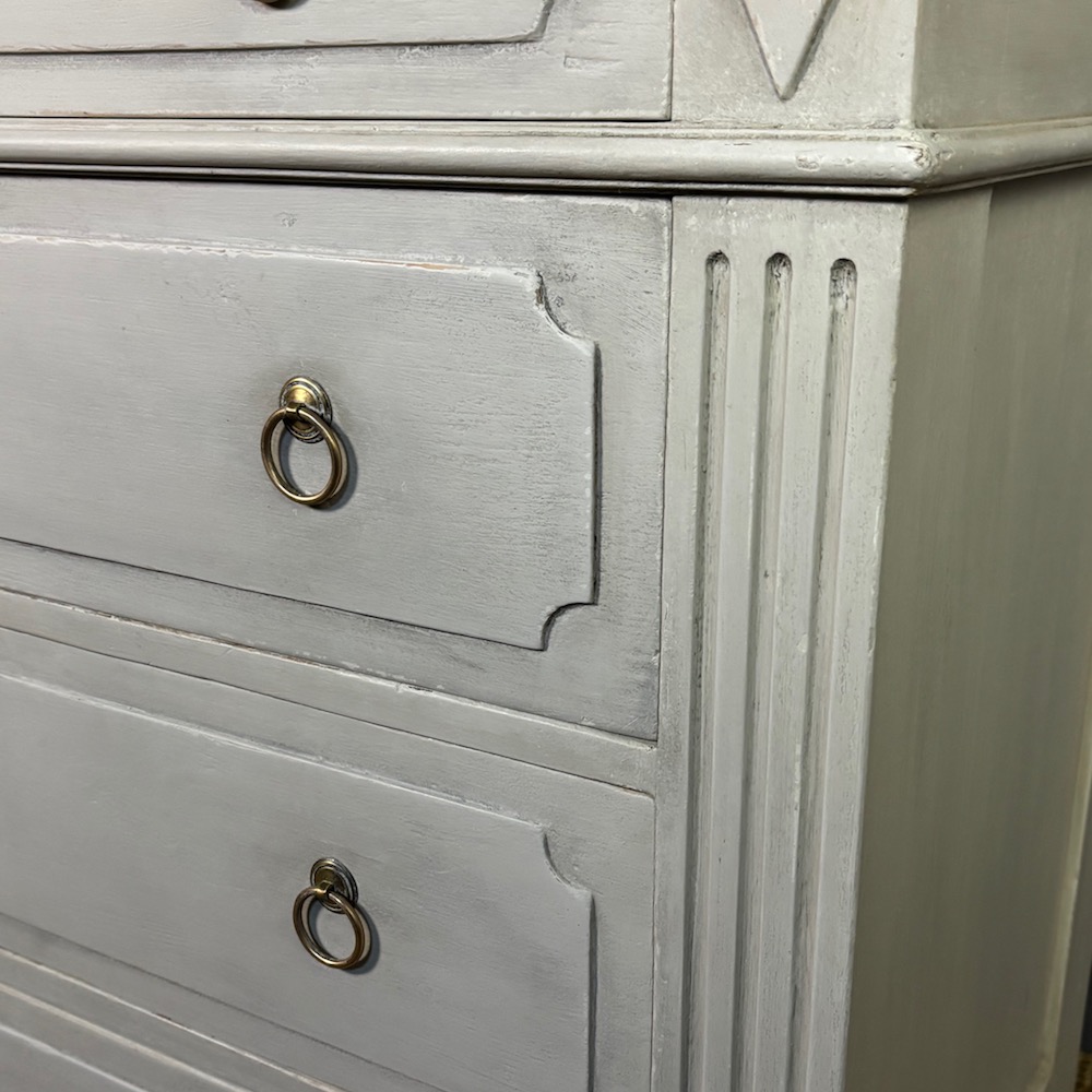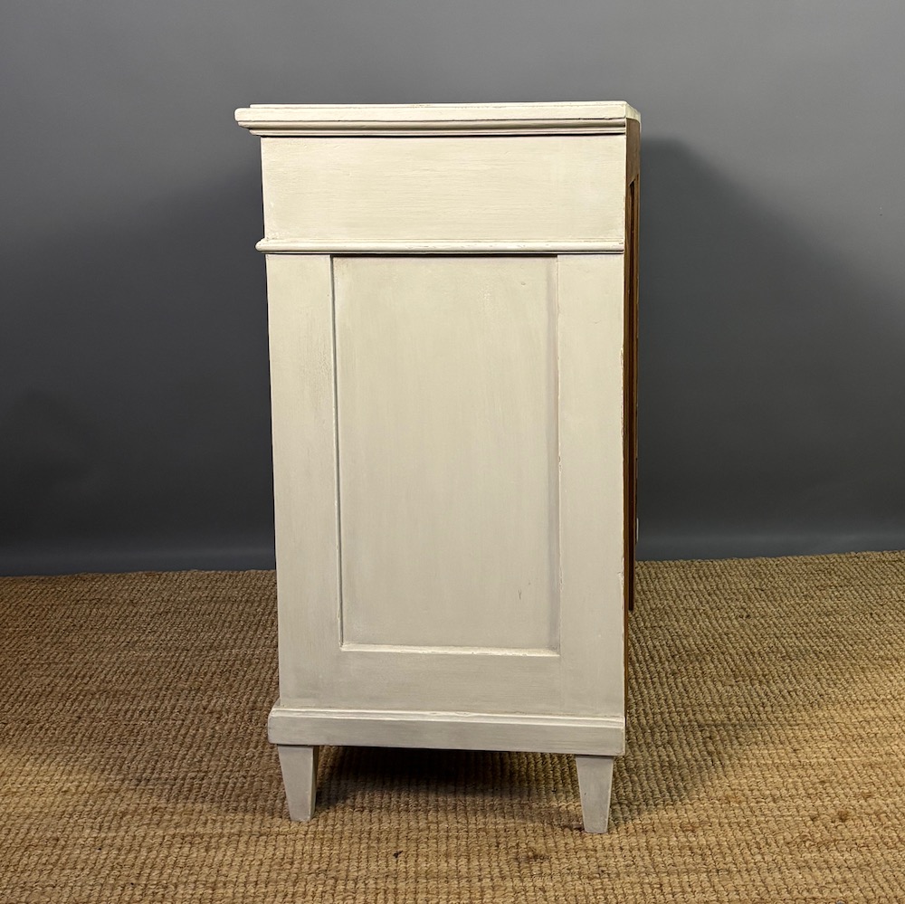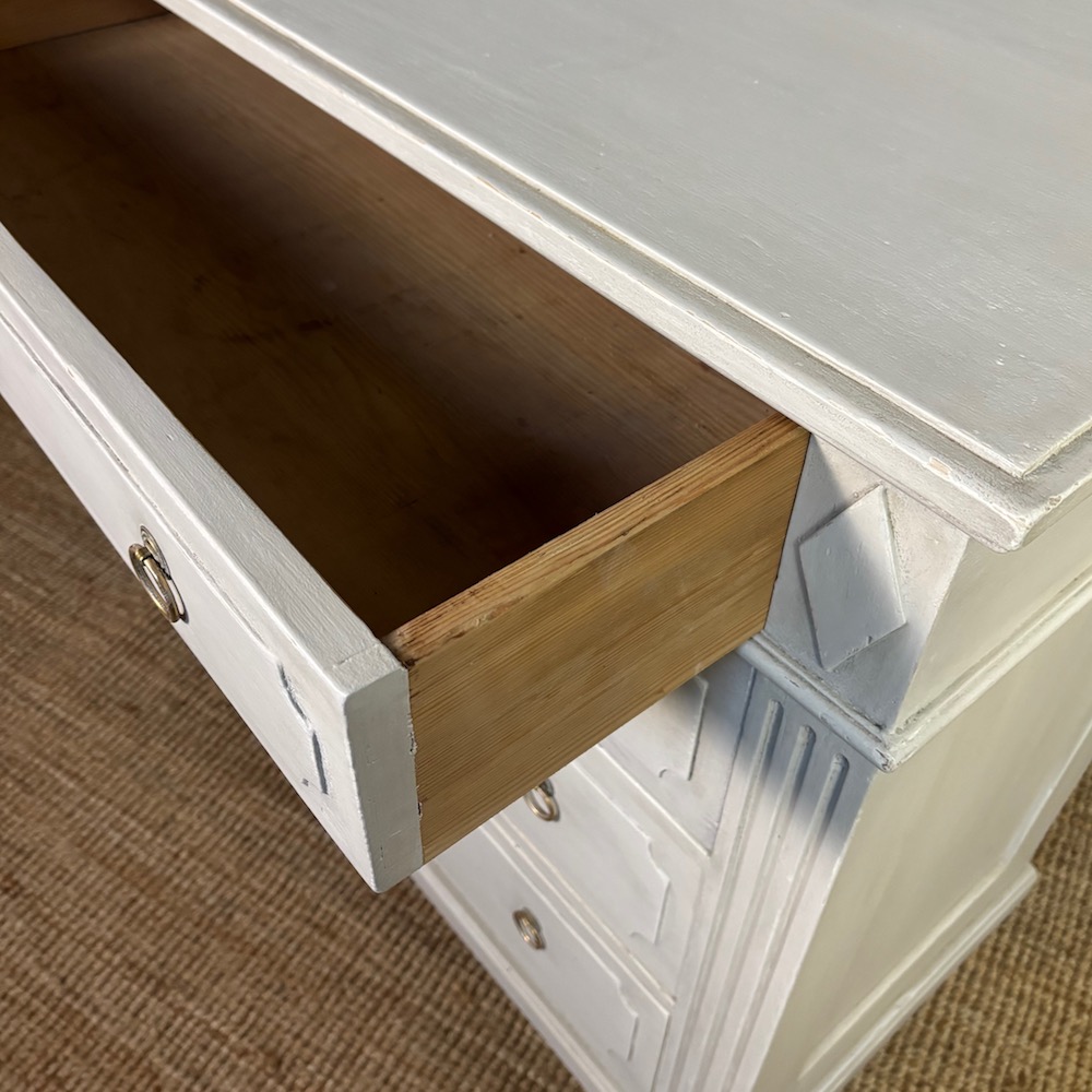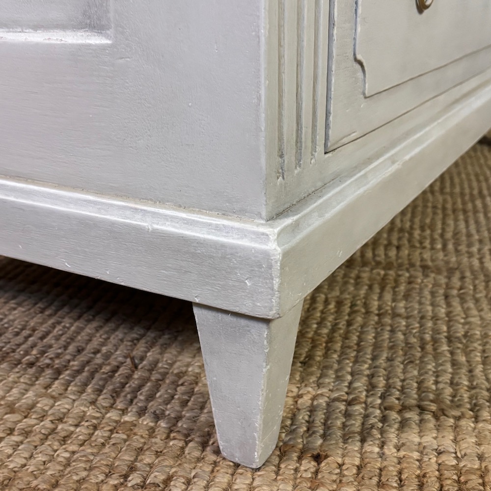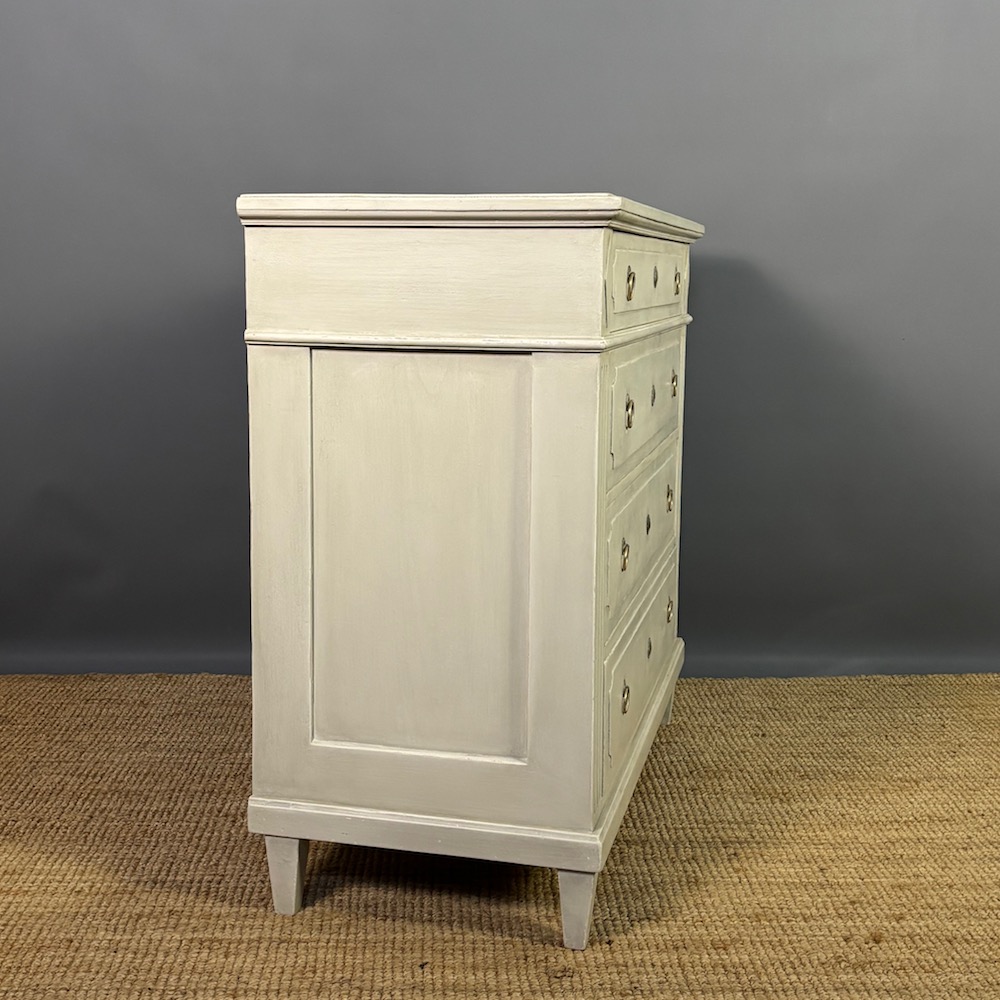 A charming Gustavian-style chest of drawers, finished in a later patinated F&B Strong White. The piece features four full-width drawers with raised, shaped panel fronts and original-style brass ring handles. Fluted side columns and diamond shaped corner motifs further evoke the clean neoclassical lines associate with late-18th-century Swedish design. All the drawer runners have been restored and the drawers run very smoothly.